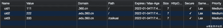 "uid=123;expires=Mon Jan 04 2022 17:42:40 GMT;path=/caikuai;domain=edu.360.cn;secure;samesite=lax";