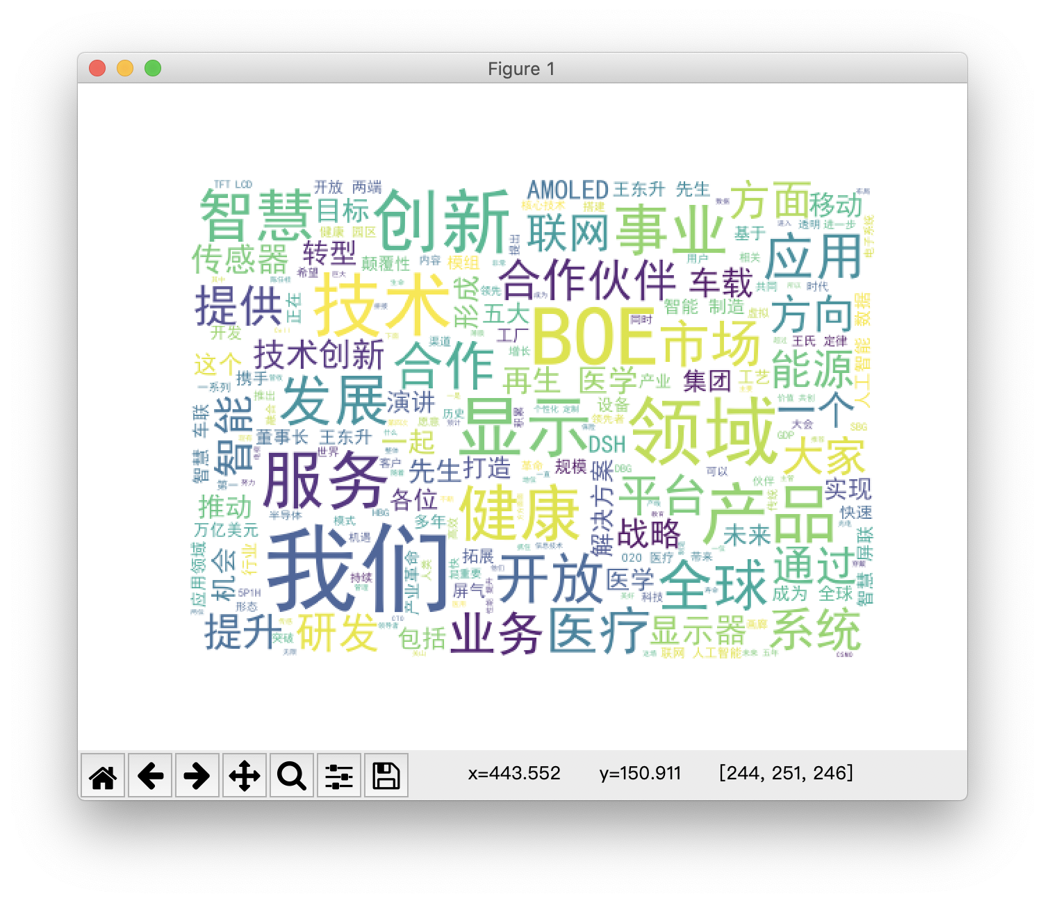 首先是效果图,我节选了 BOE(目前国内最大的面板生产企业)现任董事长在 2018 年全球创新合作伙伴峰会中的演讲,让词云通过分析这篇演讲稿来看看这位企业家为合作伙伴勾勒出的物联网蓝图是怎样的: